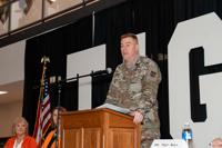 Maj. Gen. Christopher Beck, Maneuver Support Center of Excellence and Fort Leonard Wood commanding general, helped the Waynesville R-VI School District’s faculty and staff kick off their 2023-2024 school year during the district’s annual convocation. During his remarks, Beck thanked educators and staff for the incredible and life-changing work they do for our military children and highlighted the outstanding relationship and partnership opportunities the district has with Fort Leonard Wood. After Beck spoke, Superintendent Hilary Bales presented him with one of the district's coins --the 29th coin to ever be presented in the district's history.Â