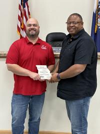 The City of Waynesville Mayor Sean Wilson, left, congratulates Economic Development Coordinator Doug Potts in earning the prestigious designation of Certified Municipal Official through the Missouri Municipal League’s (MML) Municipal Governance Institute (MGI).