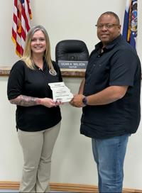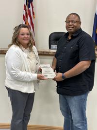 Executive Assistant to the City Administrator Denice Jacobs, left, congratulated by Mayor Sean Wilson for earning her Certified Municipal Official designation.